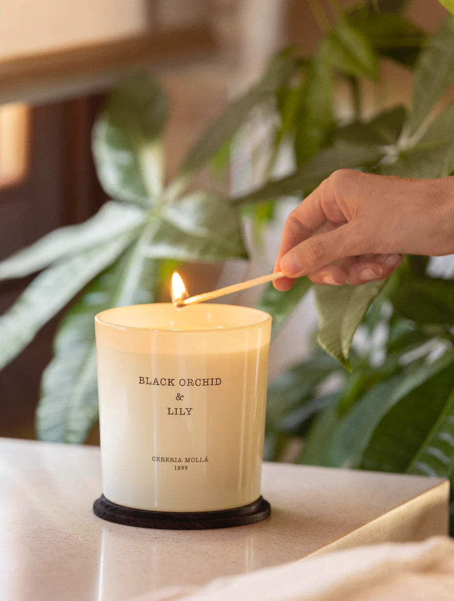 Black Orchid & Lily fra Cereria Mollá 1899. En duft av orkide og liljer med fruktige innslag av mandarin og aprikos. Vil tilføre et elegant preg av lys og glede til ethvert rom.