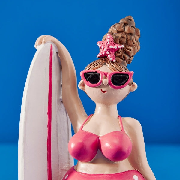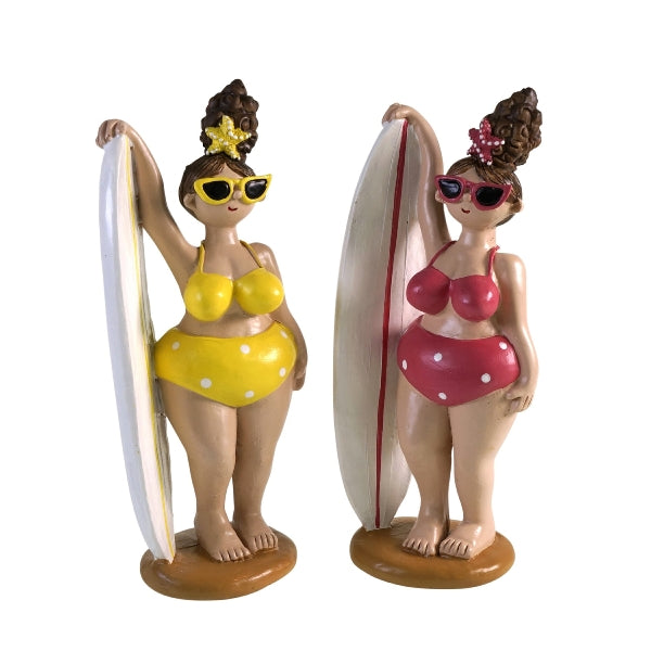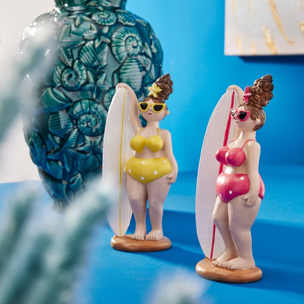 Gi interiøret et glimt av sol, sommer og bekymringsløs strandstemning med disse sjarmerende badedamene med surfebrett. Med sine fargerike badedrakter, lekne detaljer og selvsikre uttrykk sprer de umiddelbart glede og personlighet, som en liten ferieopplevelse plassert rett i hjemmet ditt.