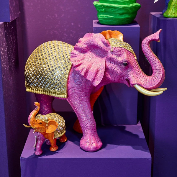Denne iøynefallende elefantfiguren på 72 cm er en perfekt blanding av tradisjonelt håndverk og moderne fargebruk. Med en strålende rosa og oransje kontrast på hver side, bringer den liv til ethvert rom. Den detaljerte gullpynten forsterker elefantens elegante utseende, og gjør den til et luksuriøst tillegg til hjemmet ditt eller som en gave. Ideell for de som ønsker å tilføre en touch av fargerik kultur og eksotisk flair til interiøret. Et perfekt midtpunkt for stuen, som garantert vil fascinere og glede gjester.