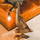 Ducky er gulvlampeversjonen og modellen av den lille, berømte bordlampen Son of a Duck fra designduoen WERNS®. Med denne skulpturelle gulvlampen hyller designduoen hjemmets skjønnhet. Den detaljerte anden holder lyspæreledningen i nebbet sitt i en gyllen metallsokkel. Lyspæren kan også bestilles og brukes som et designelement. Med sin størrelse på 90 cm passer midtpunktet til stuen, gangen og soverommet.