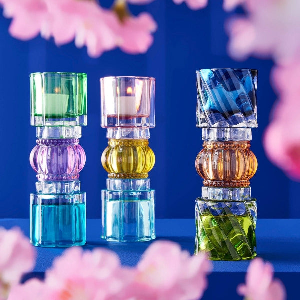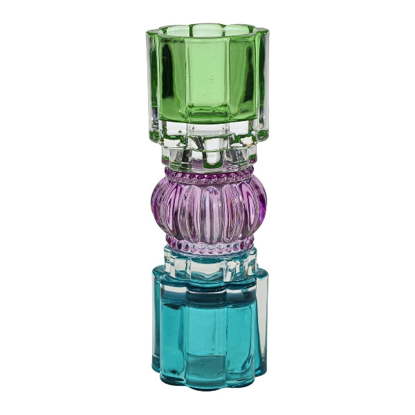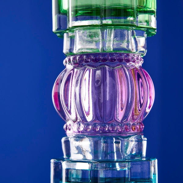 Gi hjemmet ditt et friskt og kunstnerisk uttrykk med denne dekorative lysestaken i blå, lilla og grønne toner. De transparente fargene skaper et levende og lekent lysspill som gir rommet energi og personlighet. Når lyset tennes, forsterkes fargenyansene og skaper en varm, stemningsfull glød.